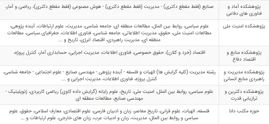 تقریبا تمامی رشته های تحصیلی میتواند در پروژه جایگزین خدمت به شرط داشتن شرایط گفته شده پذیرش بگیرد و وارد این مدل خدمت سربازی شود. در جداول پایین میتوانید لیست کامل رشته هایی که دانشگاه دفاع ملی معرفی کرده است را مشاهده کنید که تقریبا همه آن ها در مورد سپاه هم مشترک است.
